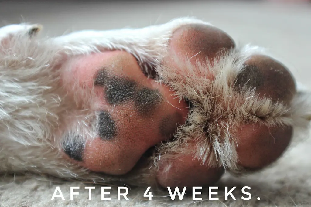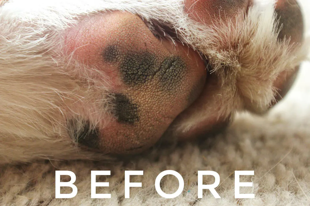 - Massage this into your dog’s paw pads until you get a smooth even covering and a nice shine.